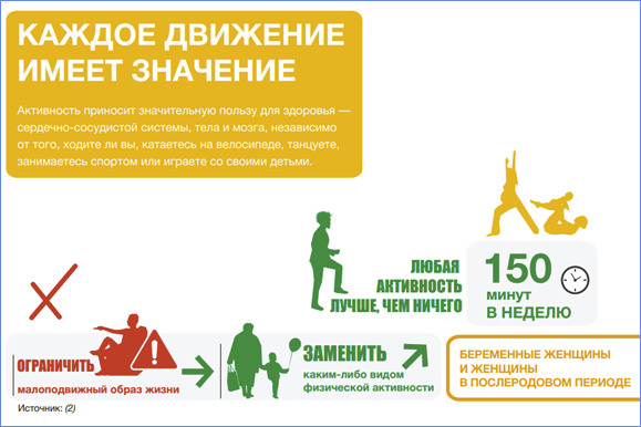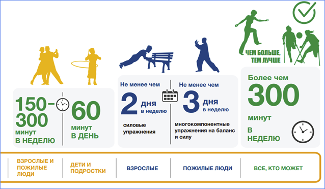Основной физической активностью является обычная ежедневная деятельность, ходьба, подъем и спуск с лестницы, работа на дачном участке, домашние хлопоты, уборка, плавание, езда на велосипеде, танцы.