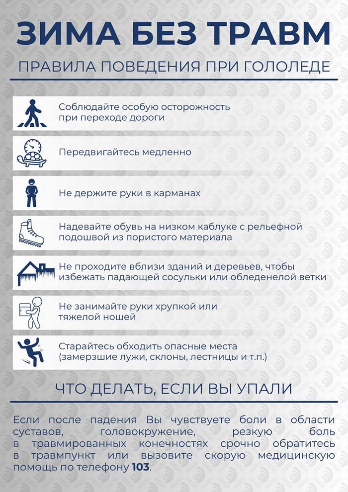 Выбирайте маршрут. Обходите стороной обледеневшие лужи, склоны и лестницы. Не ходите вплотную к стенам зданий и под крышами, где могут упасть сосульки и снег.