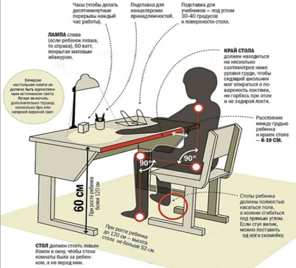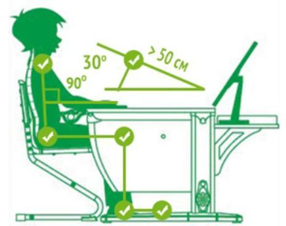 Выбор стола и стула. Нельзя допускать, чтобы ребёнок продолжительное время находился в положении, при котором его туловище сильно согнуто вперед. Вероятной причиной такой посадки может быть сидение либо на далеко отставленном стуле, либо за низким столом. Идеальным вариантом будут стол и стул с возможностью регулировки высоты, так как они могут «расти» вместе с ребёнком. Сидя на стуле, относительно пола коленный и голеностопный суставы ребёнка должны образовывать прямой угол, бёдра должны быть параллельно ему. При этом стопы ребёнка должны свободно стоять на полу. Таким образом, идеальная высота стула должна быть чуть ниже колен ребёнка. Глубина сидения должна быть такова, чтобы спиной малыш касался спинки стула, а передний край сидения подходил к сгибу коленей, но оставался зазор приблизительно в 4 пальца ребёнка. Так будет обеспечиваться хорошее кровоснабжение ног. Небольшой наклон сиденья стула способствует поддержанию осанки и сохранению концентрации внимания при работе. Высота спинки подбирается так, чтобы на нее опиралась вся спина вплоть до лопаток. Это способствует снятию напряжения со спины. Высота стола будет правильной, если руки ребёнка лежат на столе под углом чуть больше 90º относительно плеч (предплечья при этом полностью лежат на столешнице). Так снимается нагрузка с мышц рук и мышц верхнего сегмента спины. Небольшой наклон стола 5-10º полезен, но не обязателен.
